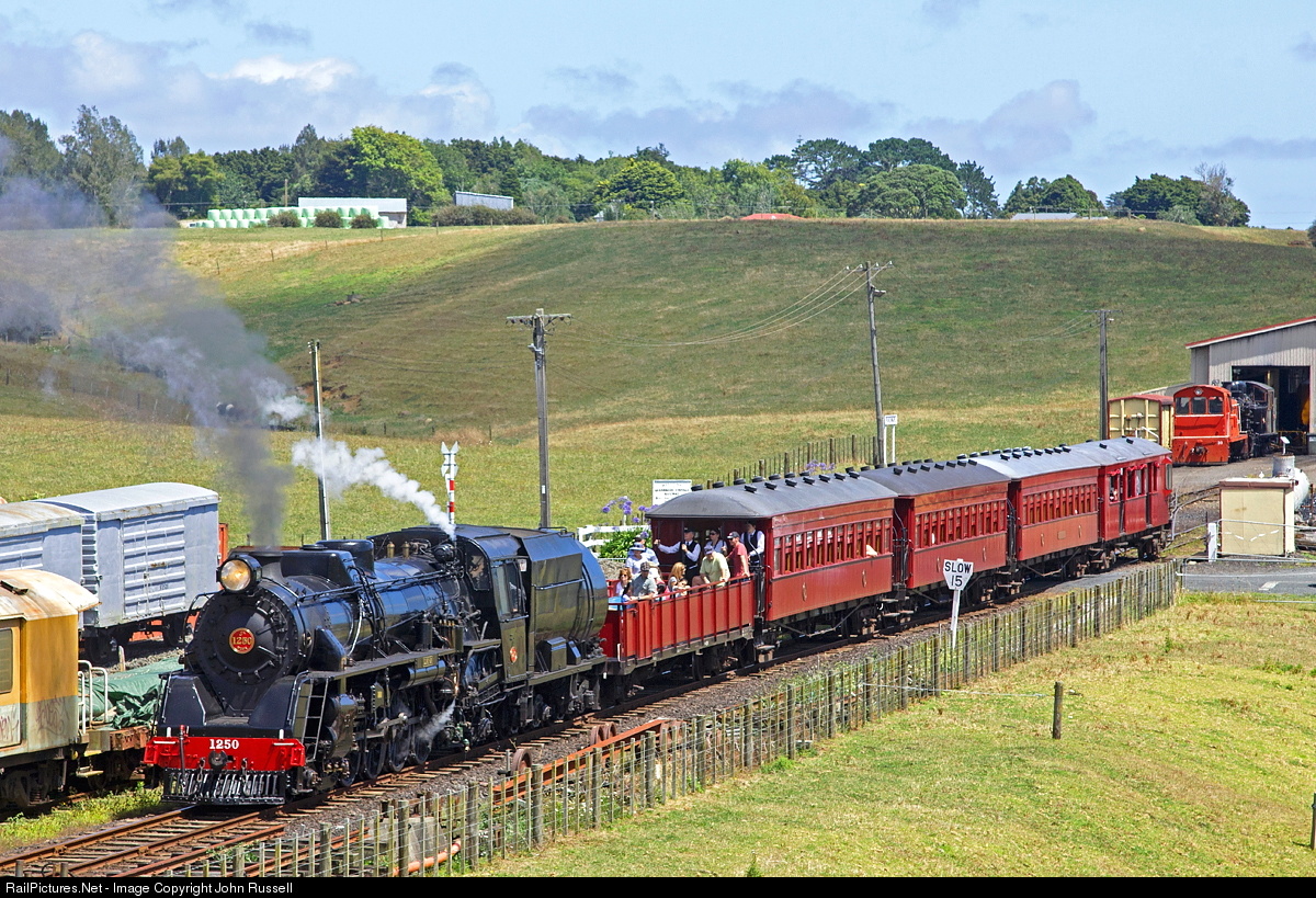 1250 was built at Hillside, Dunedin in 1949 and was among the last steam engines built for New Zealand rails. On this day 1250 was making probably the last scheduled runs after serving the Glenbrook Vintage Railway for over 20 years. To renew operational certification requires funds beyond current resources of the railway so it could be many years before this locomotive can roam the rails again. The train is seen departing Pukeoware depot where a stop is made for passengers to inspect other rolling stock or watch the coaling of the locomotive.