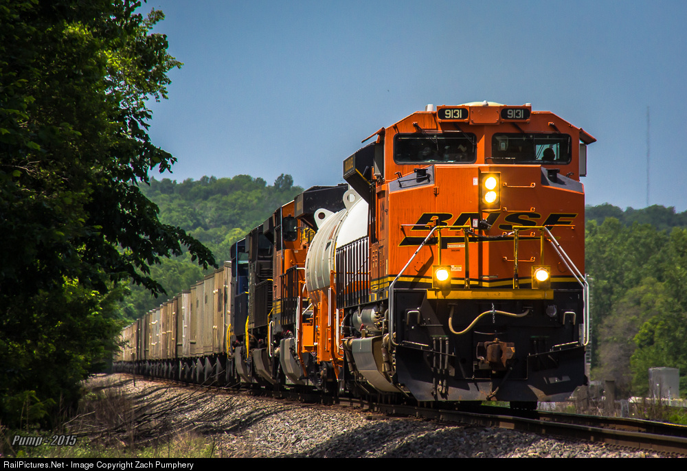 An eccentric mix of engines lead RoadRailer BNSF Train Q SAGKCK1 20A down the High Line at Morris on the BNSF Emporia Sub. Included are a pair of BNSF's LNG Dual Fuel units bracketing a fuel tender, a NS SD70M-2, and NS 8103, the Norfolk and Western Heritage Unit. This RoadRailer stopped running in November 2015.