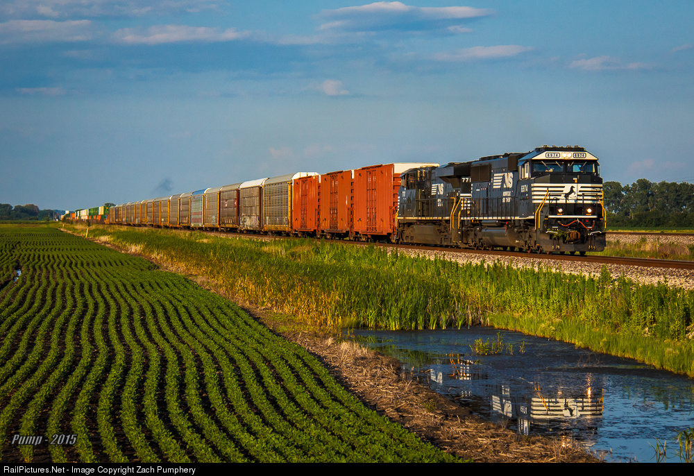 An SD60E leads NS Train 224 west on the BNSF Marceline Sub.-NS Kansas City District Main Track 1, rumbling along in notch 8 past an fantastic stand of soybeans thanks to the abundant rain this year. This was the first time I've gotten a decent shot of a 60E leading, and this is one of my favorite NS trains around KC with the variety of blocks it handles.