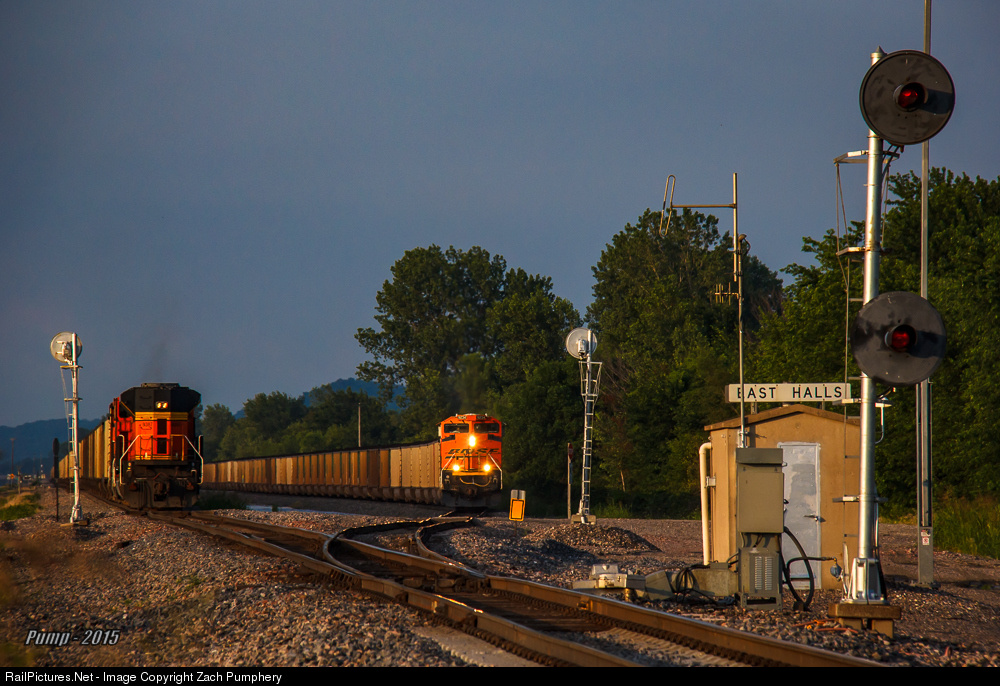 The rear end DPU's of BNSF Train E THHNAM1 49A come to a stop between the switches on the main as BNSF Train C NAMNMA1 42A does the same in the siding at Halls. The empty got the light out the west end and the eastbound load would wait for several more westbounds.