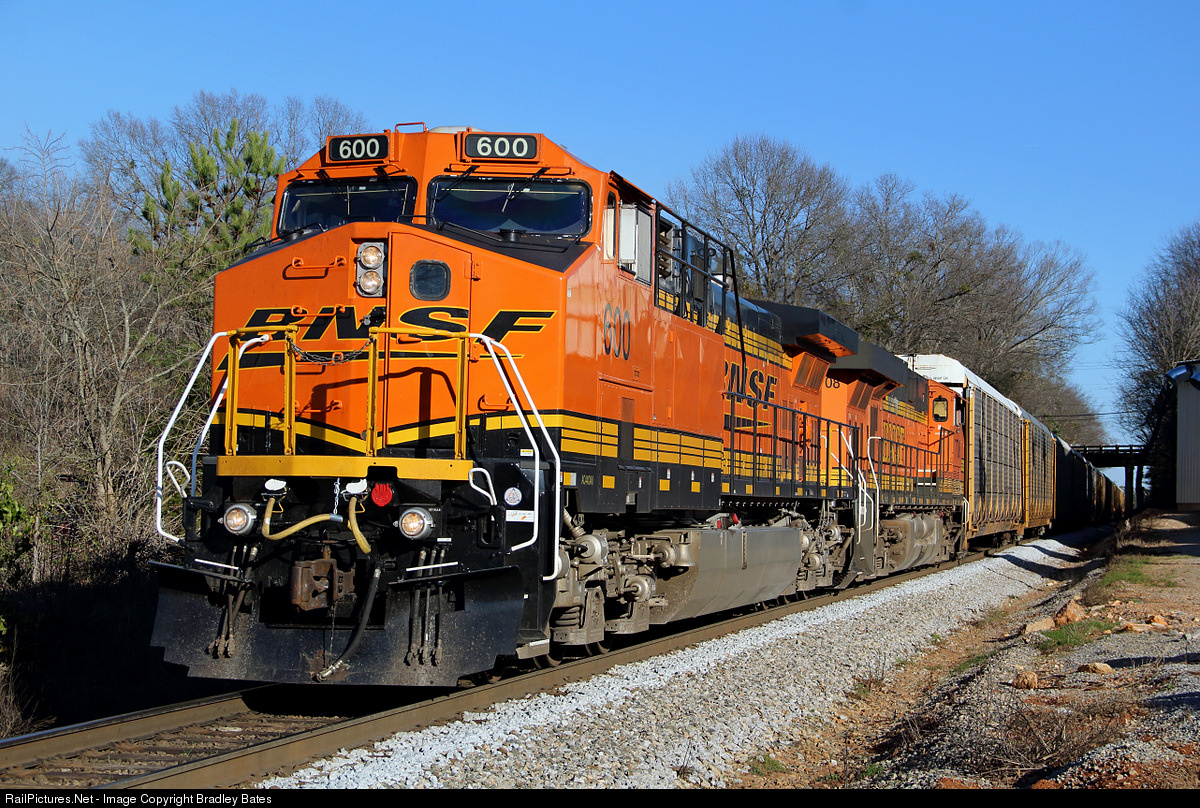 | CSX Vehicle Train Q250-31 has just departed the Road & Rail Vehicle Hub, they are seen here heading North through Talladega, AL. Bound for Birmingham with BNSF AC44C4M #600 (former ATSF C44-9W) leading BNSF ES44DC #7708 in the H-2 paint scheme |