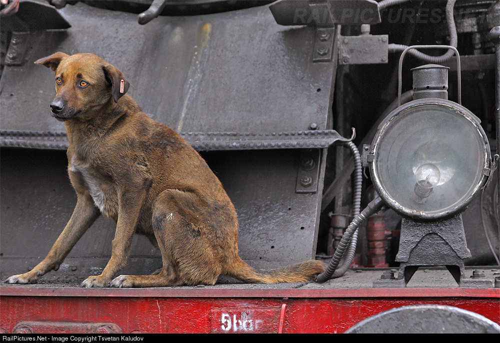 Sofia, Bulgaria. This is our dog - a talisman of steam locomotives. Her name is Valentina. She loves coal and oil, and always brings good luck. In this image - on loco series 46.03 type 1-6-2 (2-12-4)