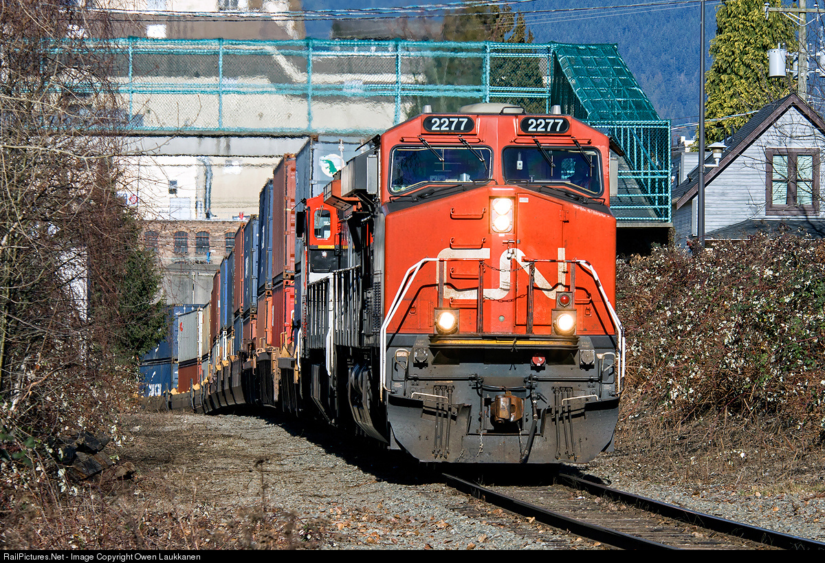 | Reportedly unhappy with CP's handling of their Centerm container traffic, CN has begun running boxes over the Burrard Inlet line and New West Sub as of January. Here's 2277 leading the midday Waterfront-Glen Yard transfer through Strathcona. |