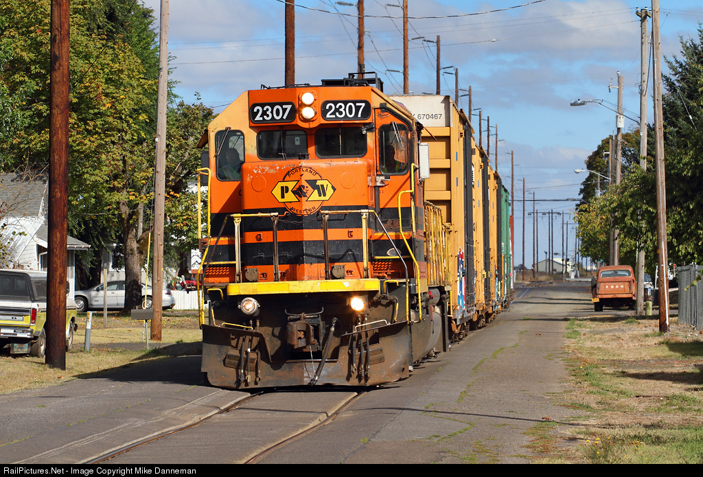Portland and Western’s American turn rocks and rolls down 4th Street in Harrisburg, Oregon, on the OE District on September 27, 2016. The folded-under plow and scrapes in the pavement show how rough the trackage is through town. This line can trace its heritage to Oregon Electric, with plenty of power lines and street trackage.