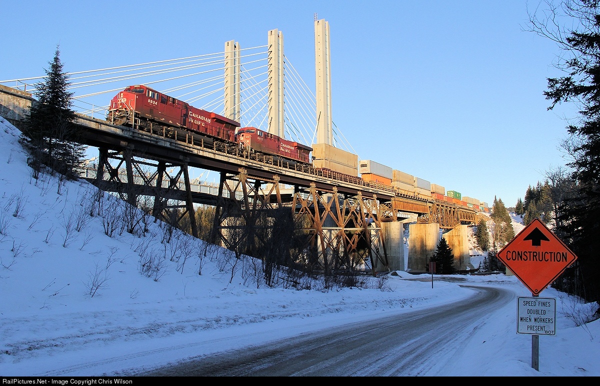 | Priority intermodal #101 speeds across the Nipigon River bridge, the largest tributary to Lake Superior. A major $110 million (CDN) project is taking place next door on the Trans Canada Highway. This section forms the narrowest transportation link in Canada. |
