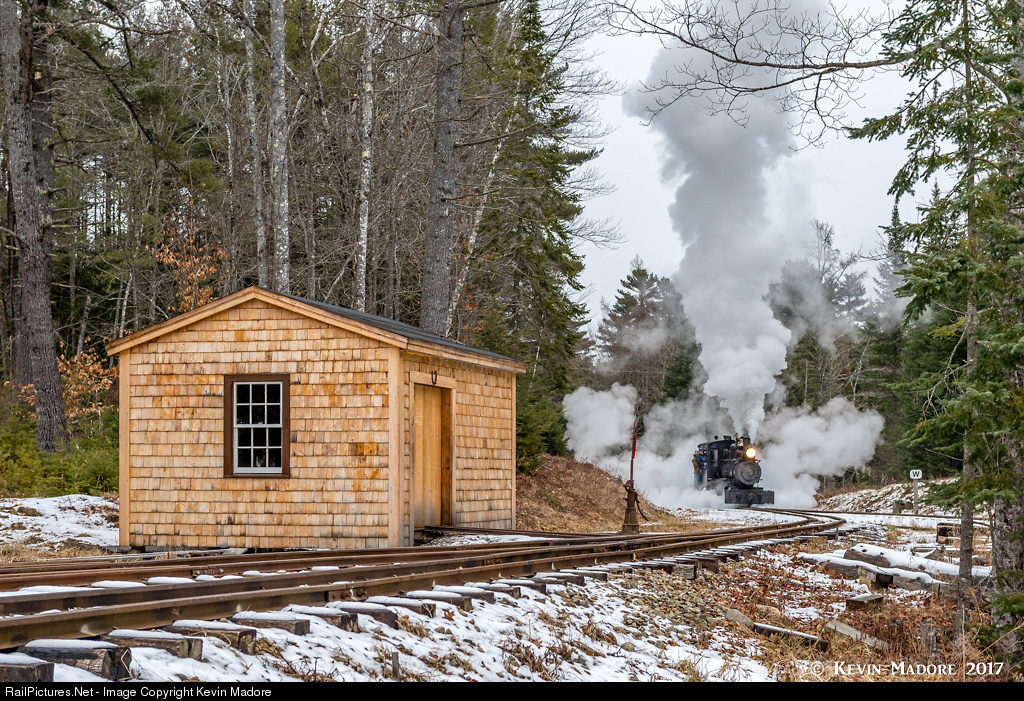 Steamy Sheepscot Morning. A cloudy, chilly winter morning finds the visiting Monson Railroad #3 emitting tall plumes of steam as she heads for the upper yard at Sheepscot to coal up for the day.