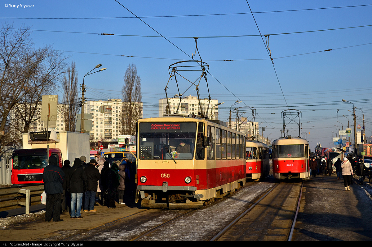 | Tramway Tatra T6B5SU #050 leading on route #28 Myloslavs'ka street - subway station "Lisova". This tramway was stopped at the stop "subway station Chernigivs'ka". This stop actually is interchange hub with subway station Chernigivs'ka". which located about 100 meters from this tramway stop.