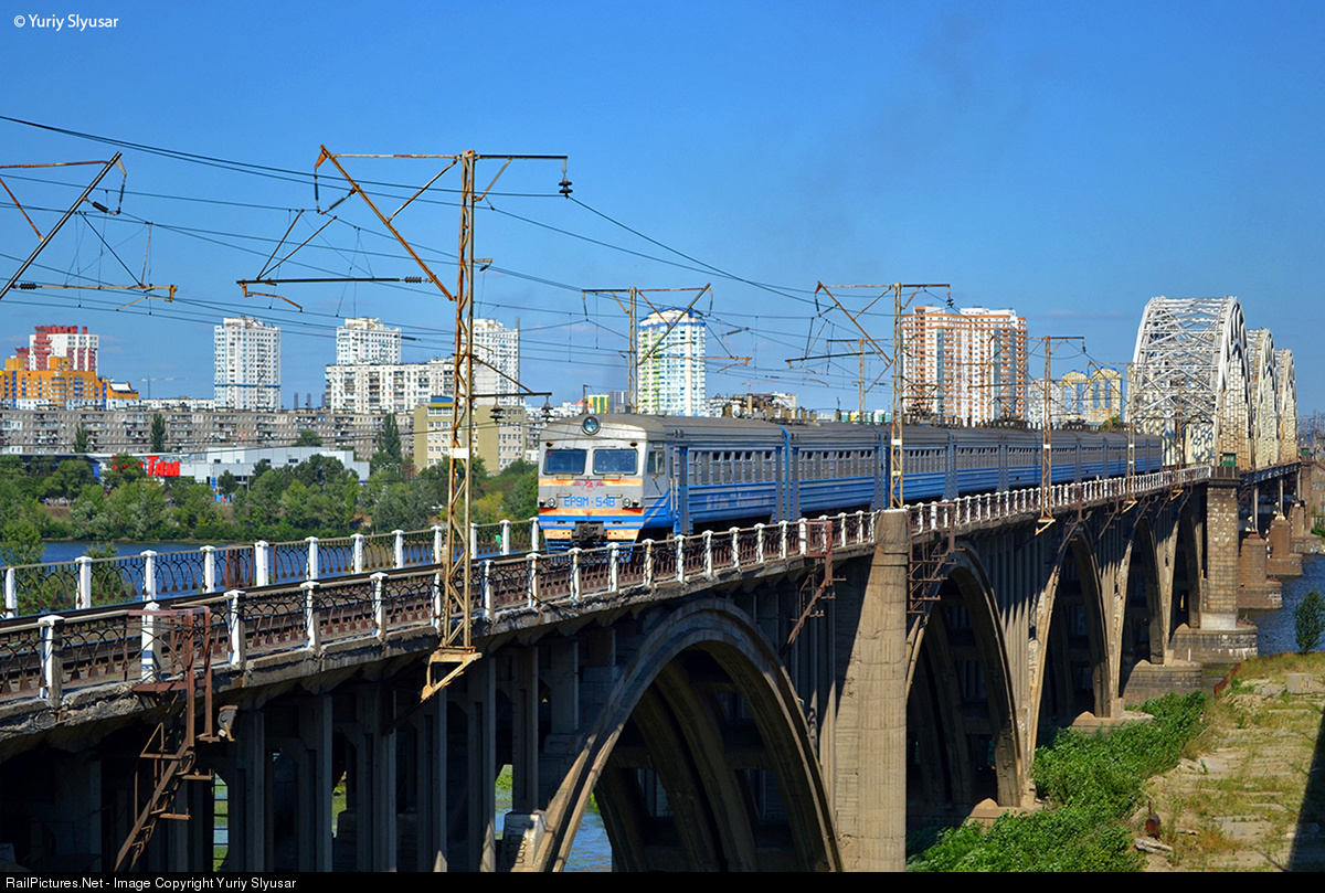 EMU set ER9M-548 goes enroute #816 Fastiv-I - Konotop eastward through Kyiv-Moskovskyi - Darnytsya stretch, which was located on Darnyts'kyi Rail Bridge over Dnipro river (was bulit in 1951, previous was destroyed during the World War II).