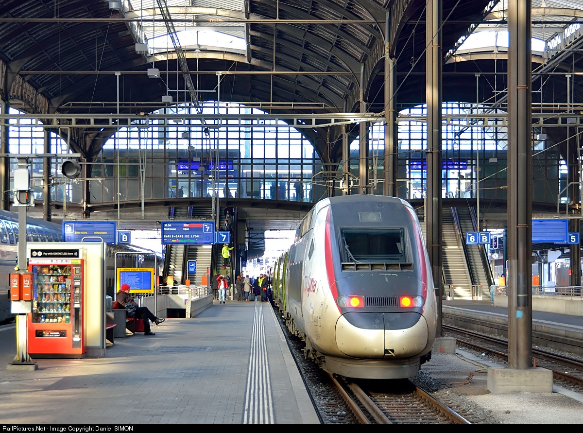 | A TGV Lyria coming from the Swiss capital city Bern has just arrived at the Basel SBB station. A few passengers are boarding the train. In a few minutes, the TGV will continue to Mulhouse, and from there, start its fast run to the Paris Gare de Lyon station. |