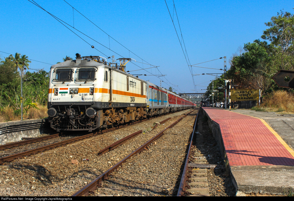 Chennai Mail Superfast Express on a perfect sunny day powered by ROYAPURAM WAP-7 skipping Paravur station