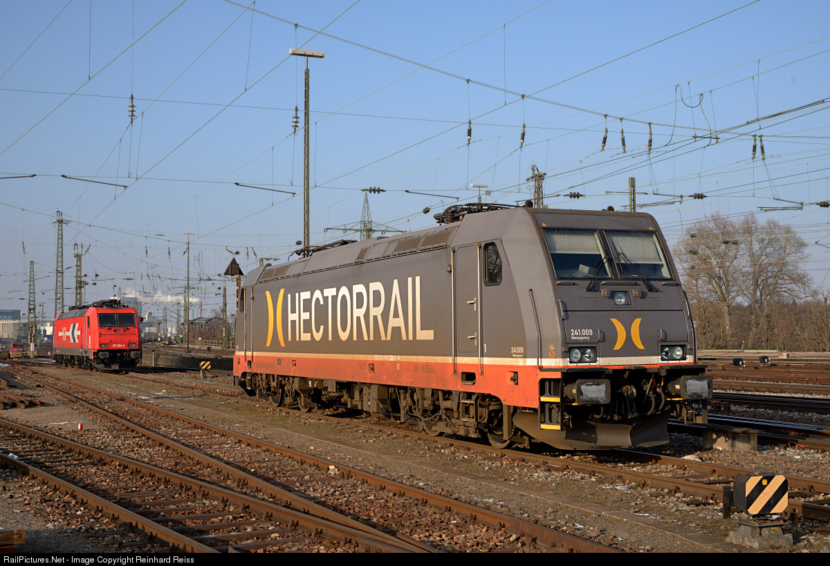 | Hector Rail 241.009 "Moneypenny" waits in the sidings of "Basel Badischer Bahnhof" (German station in Bâle, situated on swiss territory). In the background Rheincargo 185 584 can be seen.