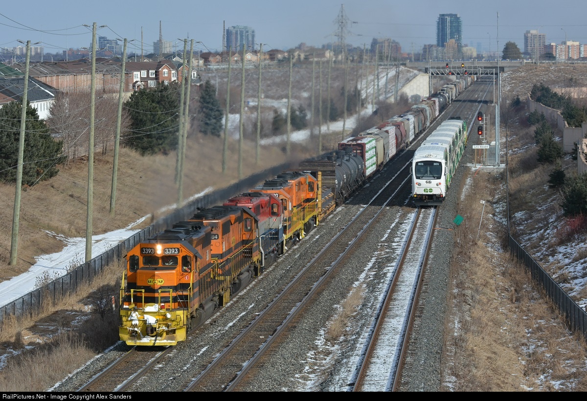 | With tunnel motor 3054 out for repairs, GEXR is back running like the old days with 5 EMD motors in notch 8 as they climb up the grade through Mount Pleasant past an EB GO Transit commuter |