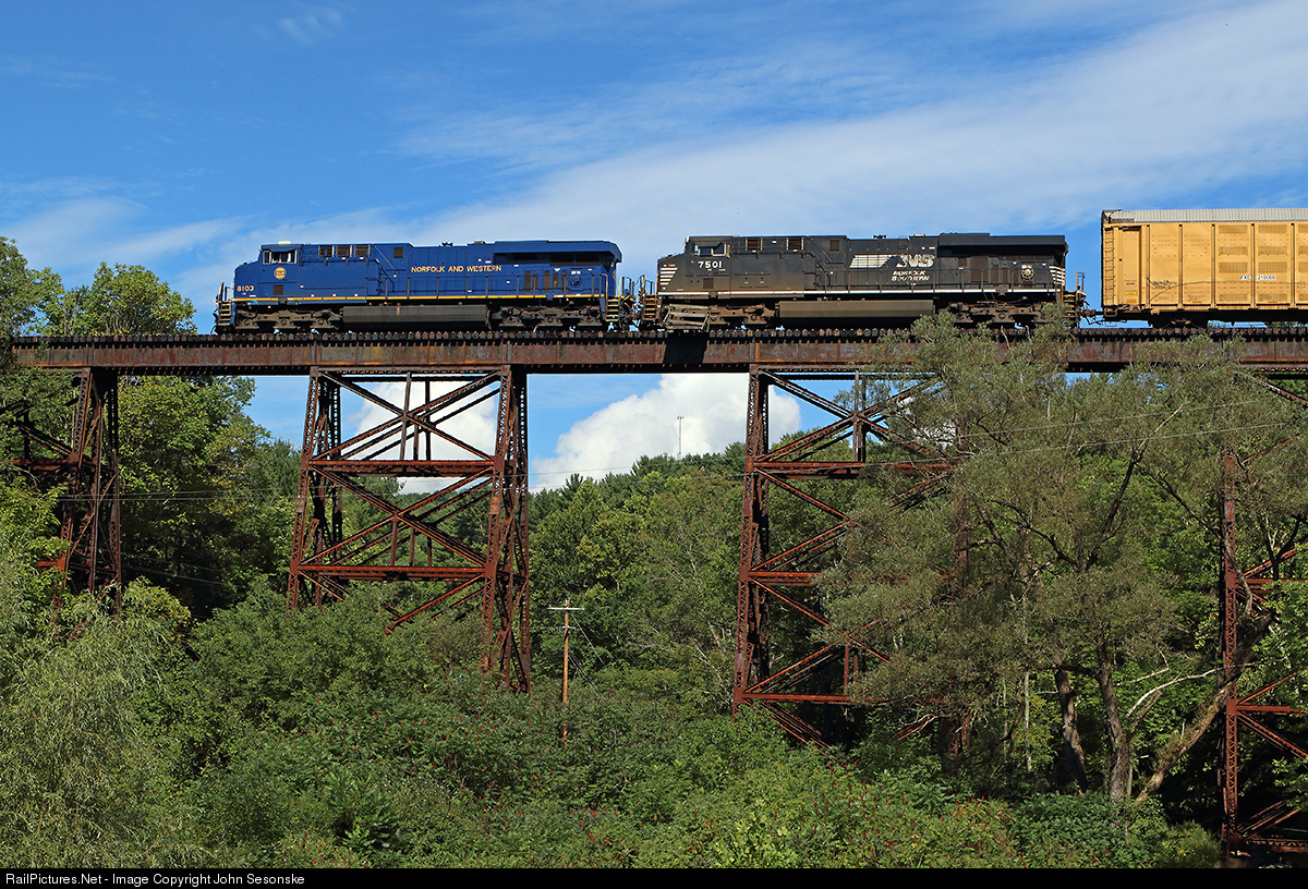 | N&W heritage on the D&H. After 4 years, the N&W heritage unit made it's first daylight run on the Delaware & Hudson. The extra empty autorack train is seen crossing the iconic D&H trestle located north of Binghamton. From N&W ownership of the D&H under DERECO in the late 1960's to N&W run through power from Buffalo after D&H expansion in 1976 to black NW U-boats sent by NS during the D&H bankruptcy in the late 1980's, N&W power has been a common site here for a long time. |