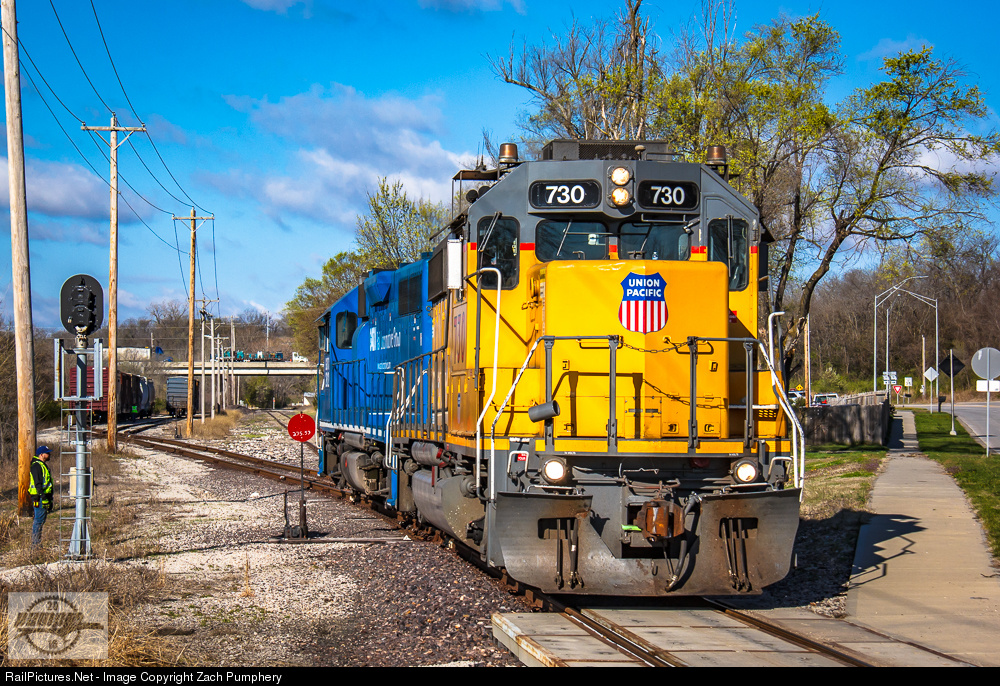 The conductor on UP Train LMR40 01 waits for the power to clear the switch back onto the lead at the Truman Road Crossing while running around their cars to take back to Lee's Summit at UP Cham-Pagne Yard, which is located on the Pixley Industrial Lead of the UP Sedalia Sub.