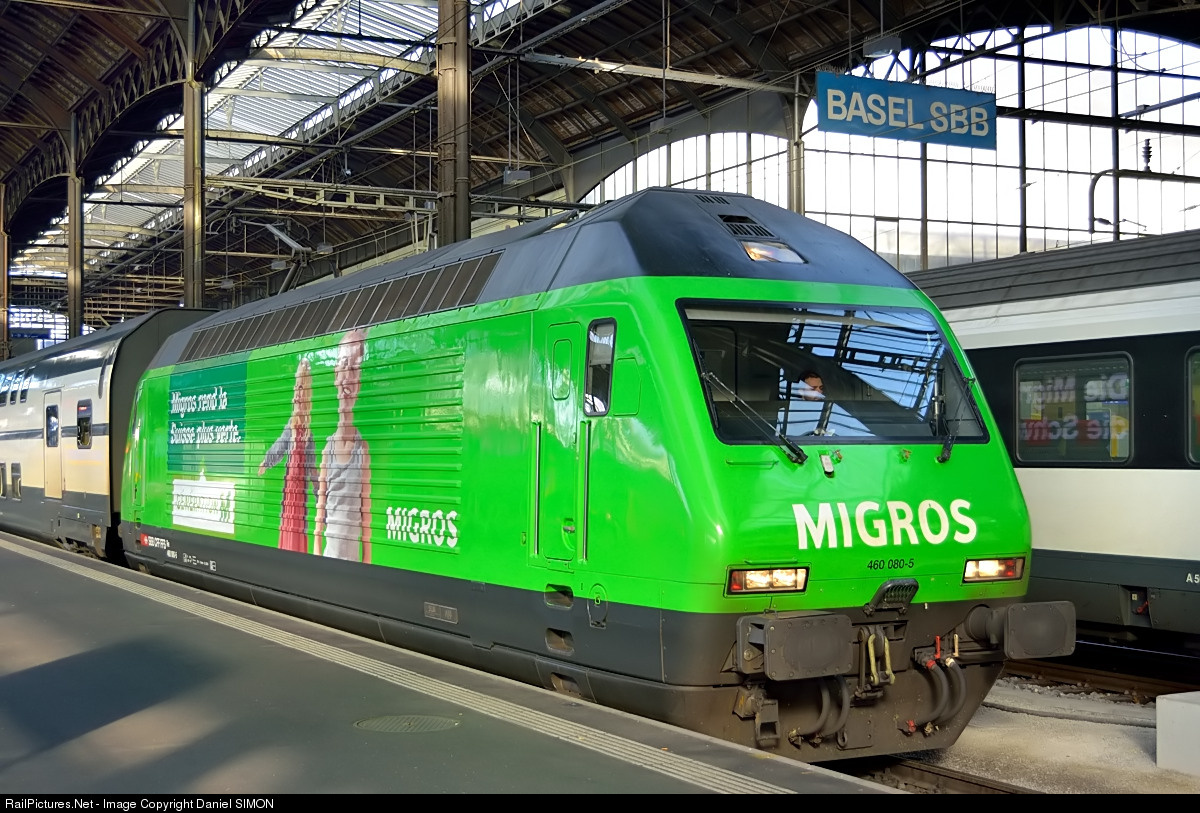 Portrait of the Re 460 080. This locomotive is currently advertising for the Swiss retailer MIGROS.