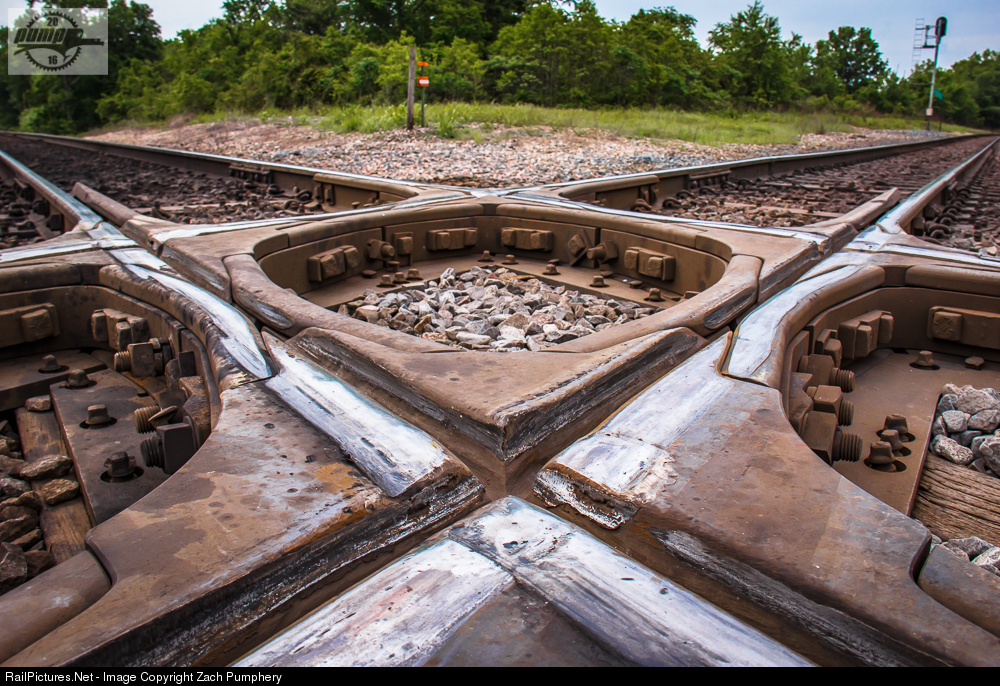 In rural Northwest Barton County, MO, the north-south KCS Pittsburg Sub. and the north-south BNSF Ft. Scott Sub. cross in an area surrounded by former coal strip mines. This view is looking southeast, with the KCS leading off to the top right, and the BNSF to the top left.