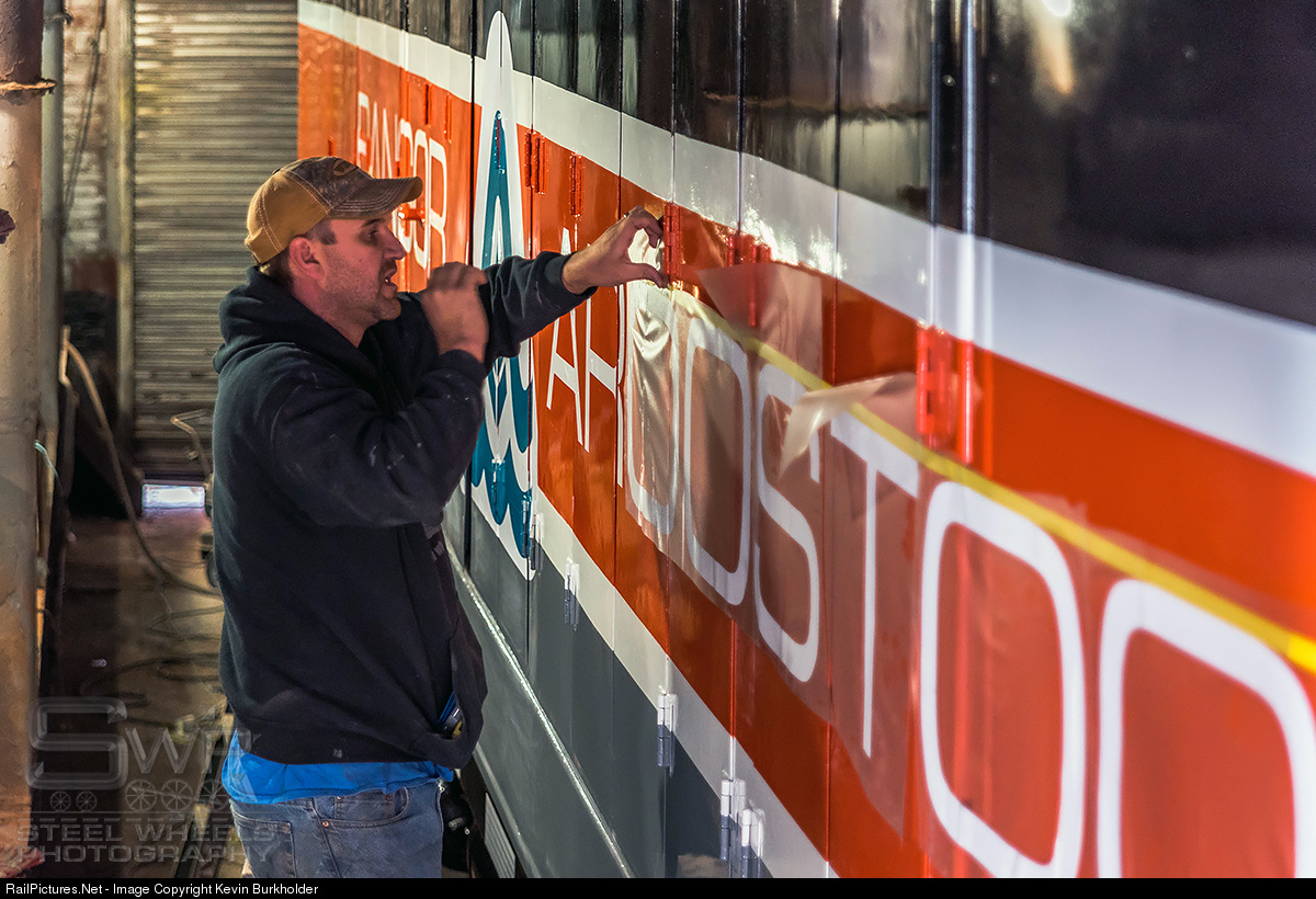 Following painting of the Bangor & Aroostook heritage tribute unit, owner of the Southern Pride Mobile Locomotive Painters, Devin Frazier, applies the lettering and final touches to the beig cowl-body EMD at the CMQ Derby Shops in Milo, Maine.