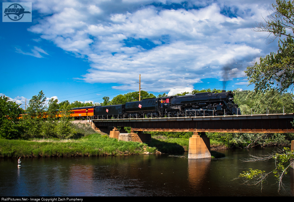 Milwaukee Road 261 leads Amtrak Train #992, a Friends of the 261 Excursion returning from the Lake Superior Railroad Museum in Duluth, MN to Minneapolis. While encountering signal issues on the BNSF Hinckley Sub., the engine proceeded for several miles at restricted speed, exchanging waves with a fly fisherman angling in the Snake River at the bridge.