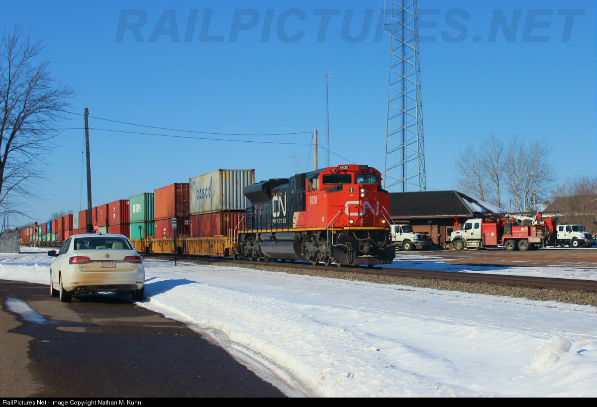 | CN 8830 one unit wonder leads a mixed of intermodal, automotive, and general freight south where it will get a new Stevens Point. |