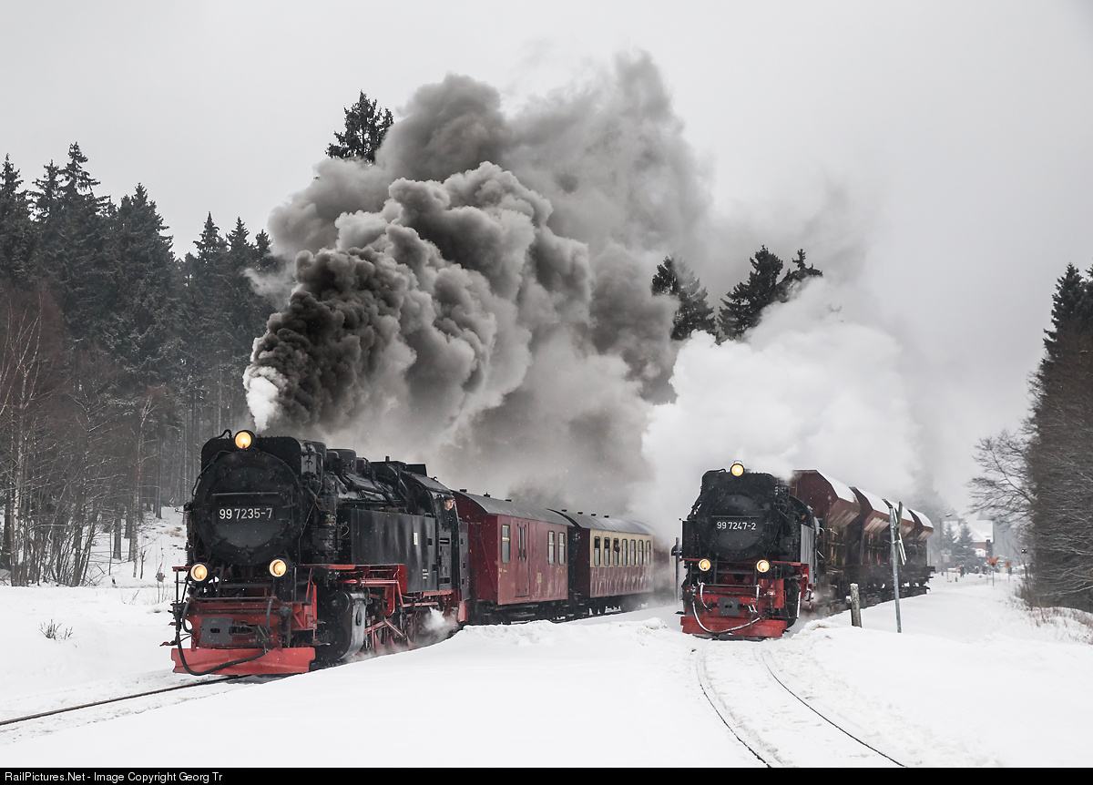Simultaneously steamtrain departure from Drei Annen Hohne. On the left service train 8931 from Wernigerode to the Brocken, pulled by 99 # 7235, on the right Tanago photo freight with 99 # 7247, pulling 4 roll cars with standard gauge ballast cars, towards Eisfelder Talmühle.