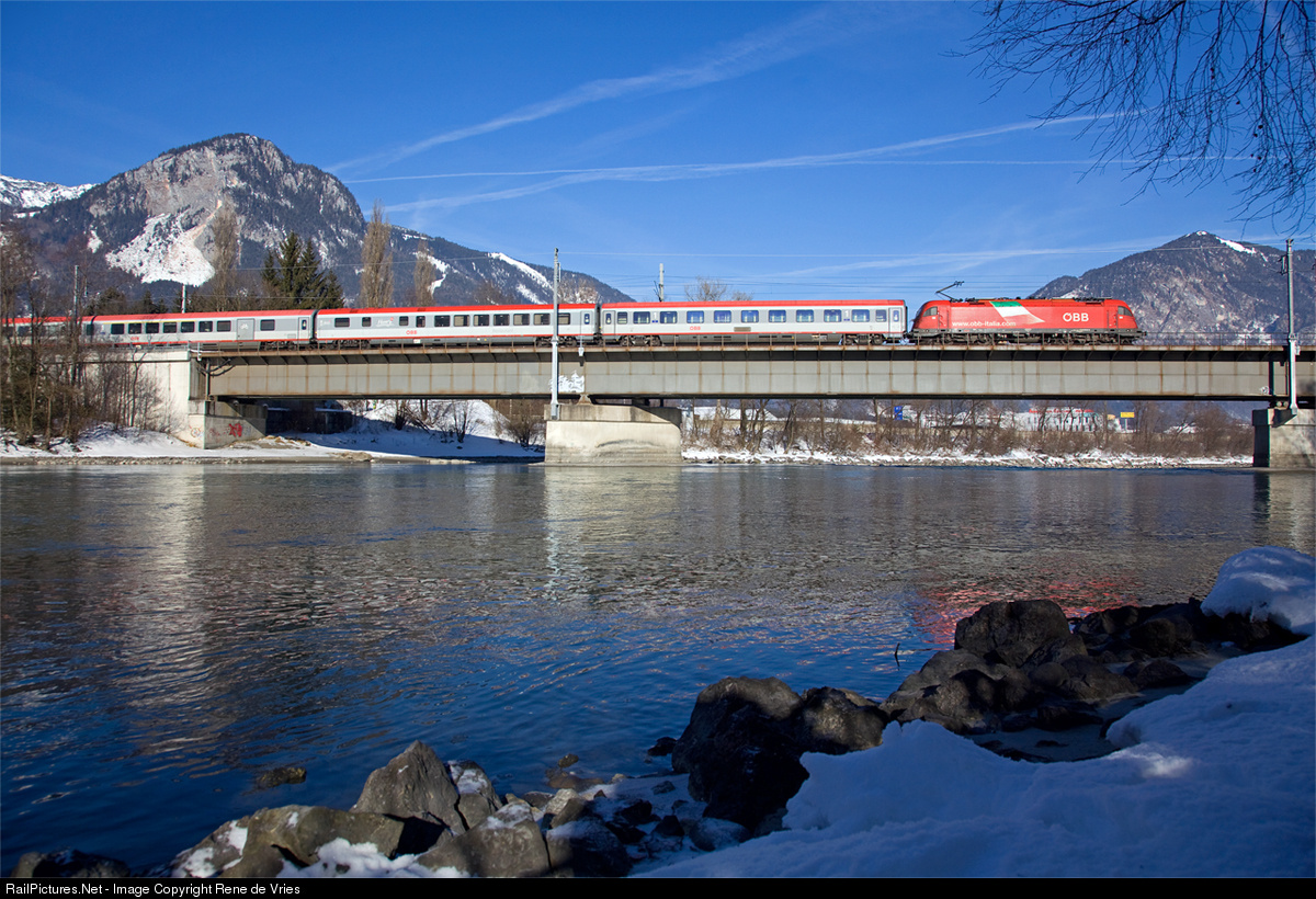 ÖBB locomotive 1216 013, hauling Eurocity 286 (Innsbruck - Munich) passes the river Inn near Brixlegg.