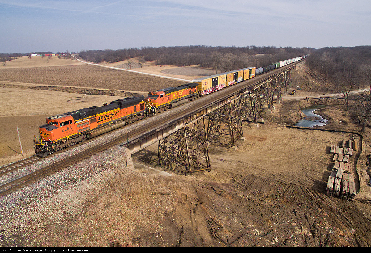 | The westbound BNSF manifest from Galesburg to Temple, TX crosses the massive Media Trestle east of Media, IL. Materials for construction of the new bridge are being staged below. |