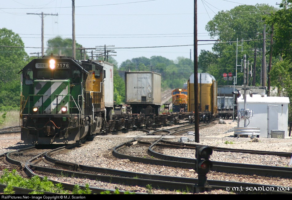 The UP transfer MMENLD 04 comes off the CN Memphis Sub at Broadway onto BNSF track enroute to UP track and a river crossing on the Harahan Bridge. Notice the BNSF empty coal train in the background.
