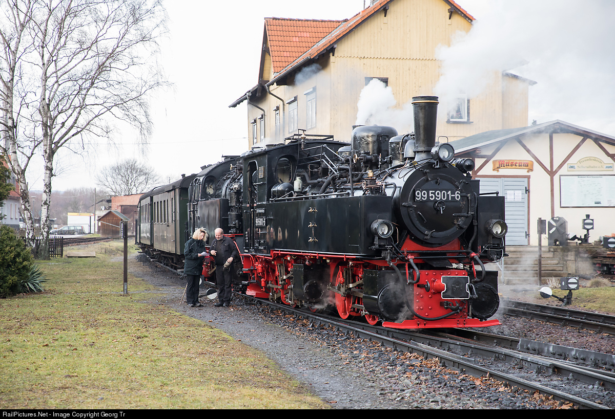 The female conductor is handing paperwork to the engineer of the "Mallet" 99 # 5901 in Gernrode. The Tanago photo train will soon start to Alexisbad, Harzgerode, Eisfelder Talmühle, Drei Annen Hohne for Wernigerode.