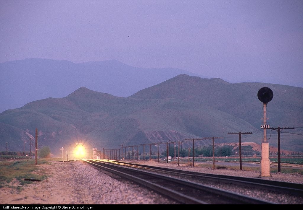 At dusk, a Santa Fe westbound approaches Sandcut with headlights glaring, while beyond the subtle hues of the mountains become more obvious than during bright daylight.