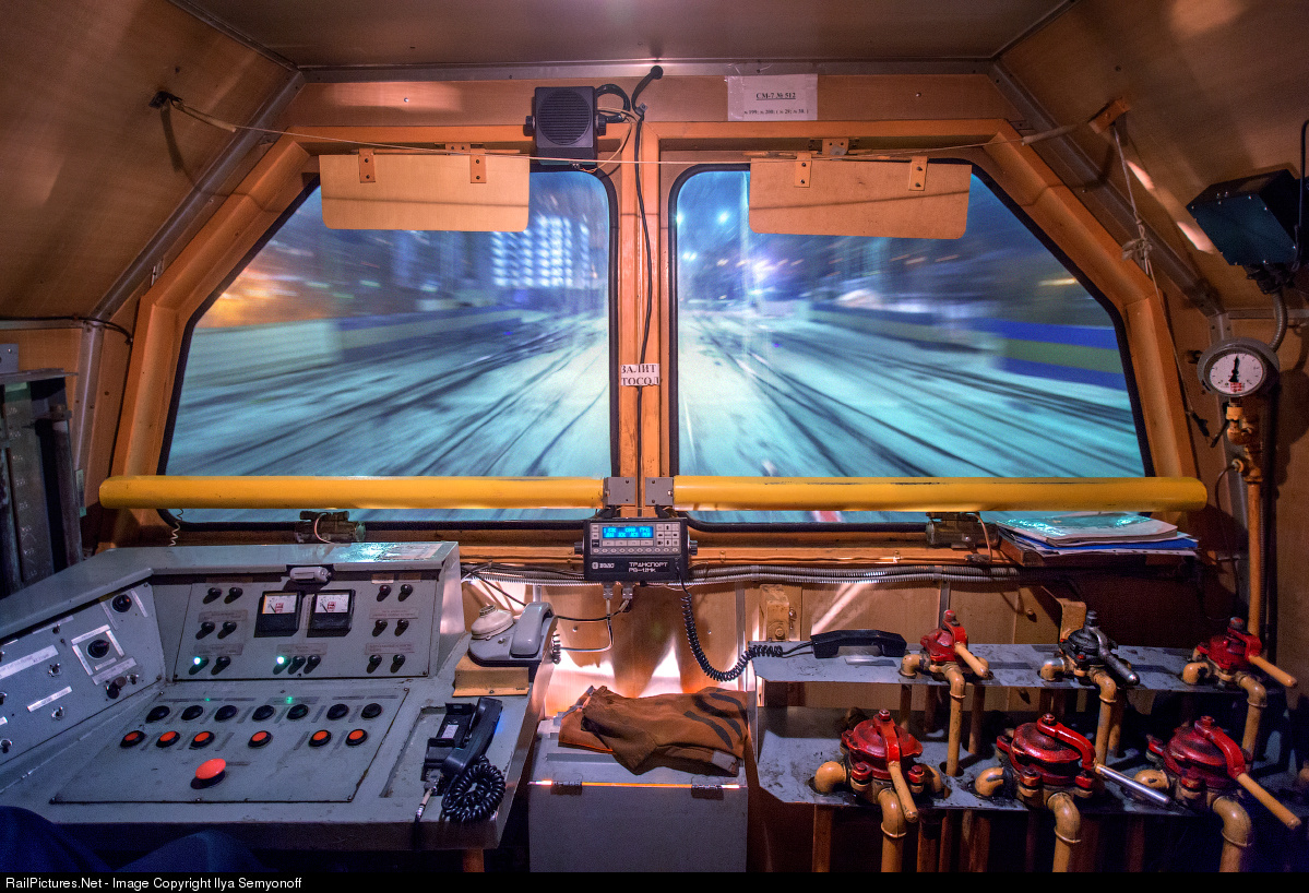 Cab interior of a Snowplow "SM7", which cleans tracks at the Yekaterinburg station.