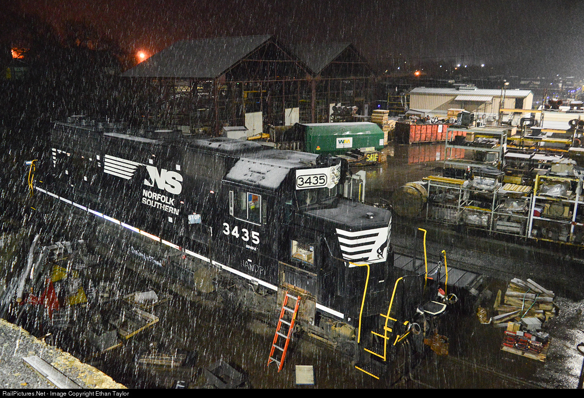 | NS 3435 rests in bay 27 of the famed Juniata Shops. This ex-PRR SD40 has fallen victim to the SD33ECO rebuild program, meaning that nearly everything besides the frame, trucks, and a few other parts will be replaced. This is one of six or so ex-PRR SD40's left on the NS Roster. |