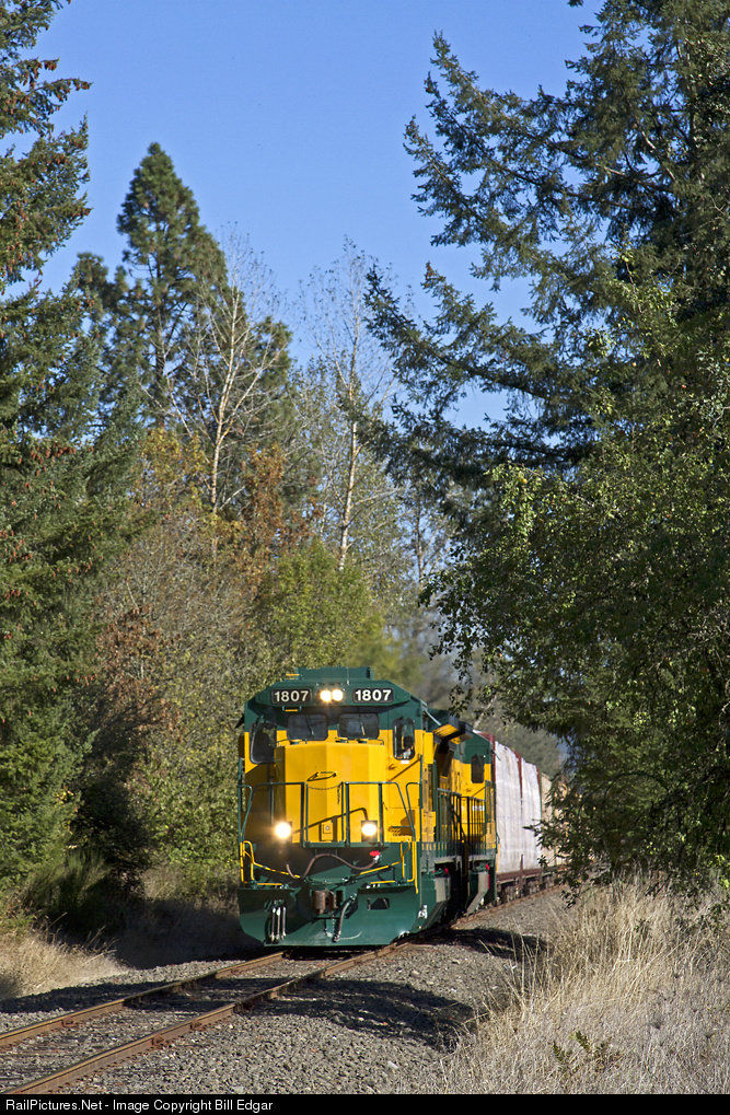 AERC 1807 leads its local northwest back to Lebanon after switching the Weyerhaeuser Co. lumber mill near Waterloo, OR. Looking like it could be a CNW train in Wisconsin's north woods, the crew on this train have had a busy day. They first ran a turn from Lebanon to Albany, then a cut of log cars northeast to Crabtree. Once back in Lebanon, they set up cars and made this run to Waterloo and back. All in a days work.