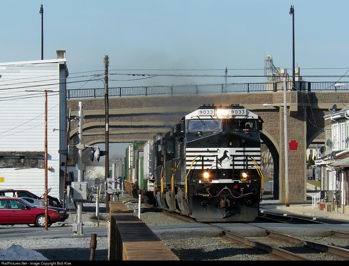 | The 212 is at full track speed (40 mph) passing the "bloody bucket" 28th Division red keystone on the 9th Street viaduct. The old Railroad House on the left (now apartments) no longer serves steaks, and the "railfan row houses" on the right along Scull Street are occasionally available for rent ($650/mo) or sale. No. 9033 was built in February of 1997 as a C40-9W and was later uprated to 4,400 hp. |