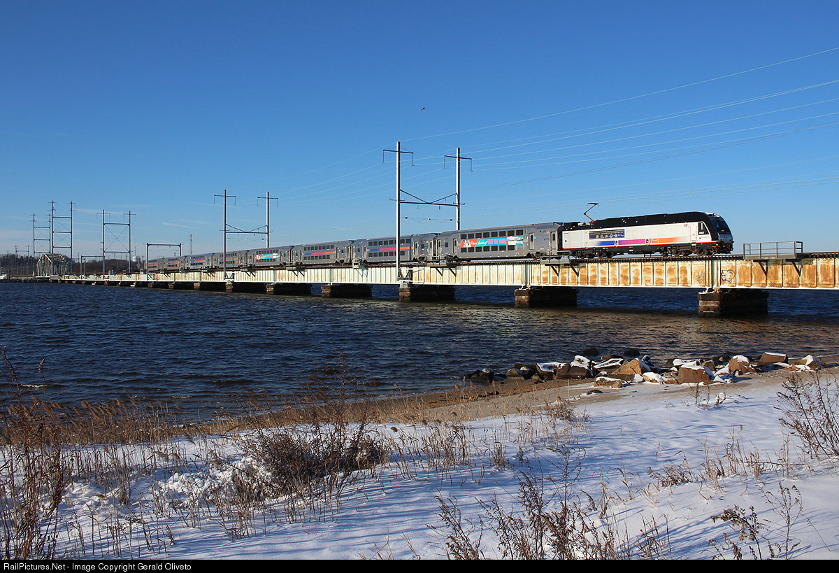On a frigid February morning, a direct train from Bay Head to New York crosses the Raritan River at Perth Amboy. The lead unit, ALP-45DP no. 4507, is decorated to honor military members and veterans.