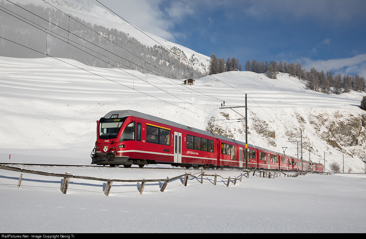 | Two coupled ABe 4/16 "STZ" (Stammnetz Triebzug) # 3102 and 310. are running as inforcement train RE 2119 from Chur to St.Moritz on the occasion of the FIS Alpine Ski World Championships 2017. This trains run regularly in the commuter service around Chur. |