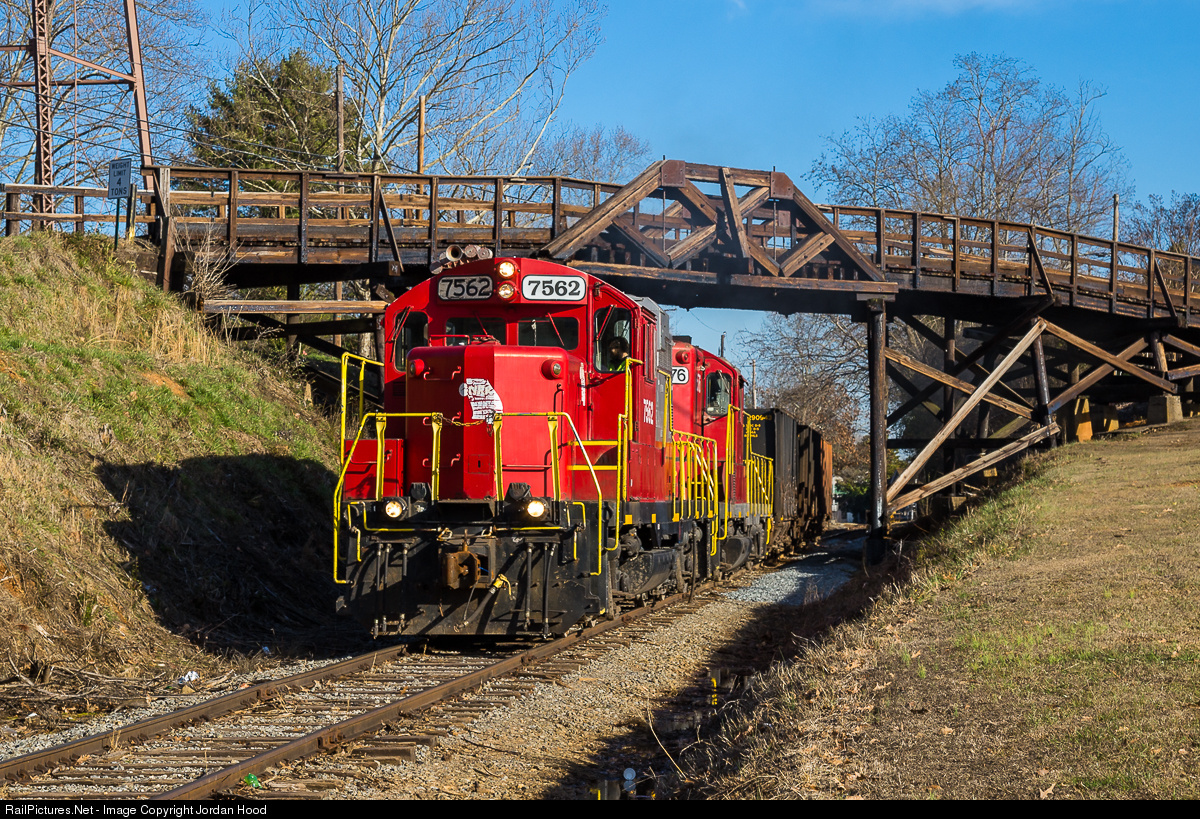 | A later than usual Whitestone turn passes under the beautiful wooden bridge in downtown Jasper with GP10 No. 7562, GP9 No. 6576, and three empty hoppers. With the arrival of newer Patriot Rail locomotives, time is likely running short for these former Pennsy and B&O relics. |