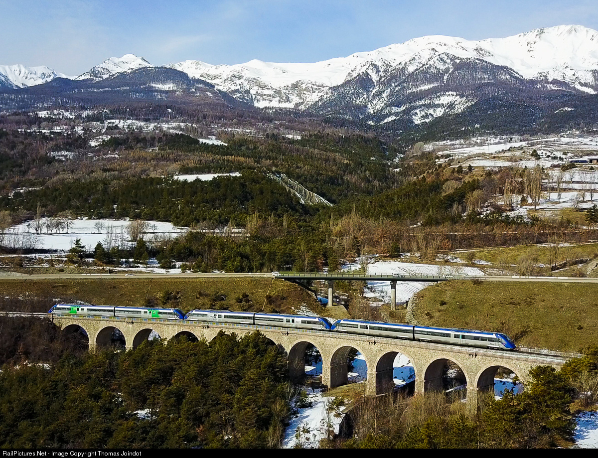 The regional train from Briançon to Valence is reinforced with 3 DMUs on this winter holiday saturday. It crosses the Bramafan viaduct on its way west.