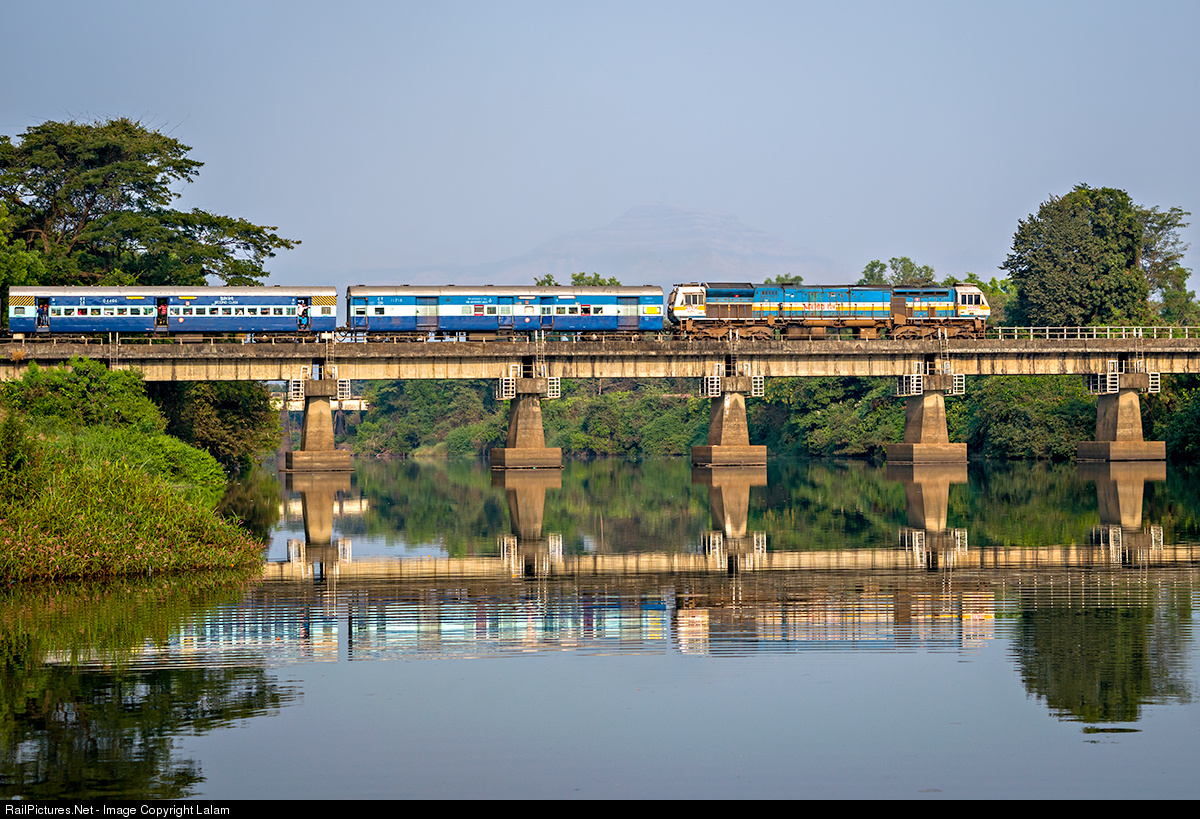 Dual cab EMD, leads Hapa to Tirunelveli biweekly express, making a nice reflection in the water of Kaal river in Mangaon.
