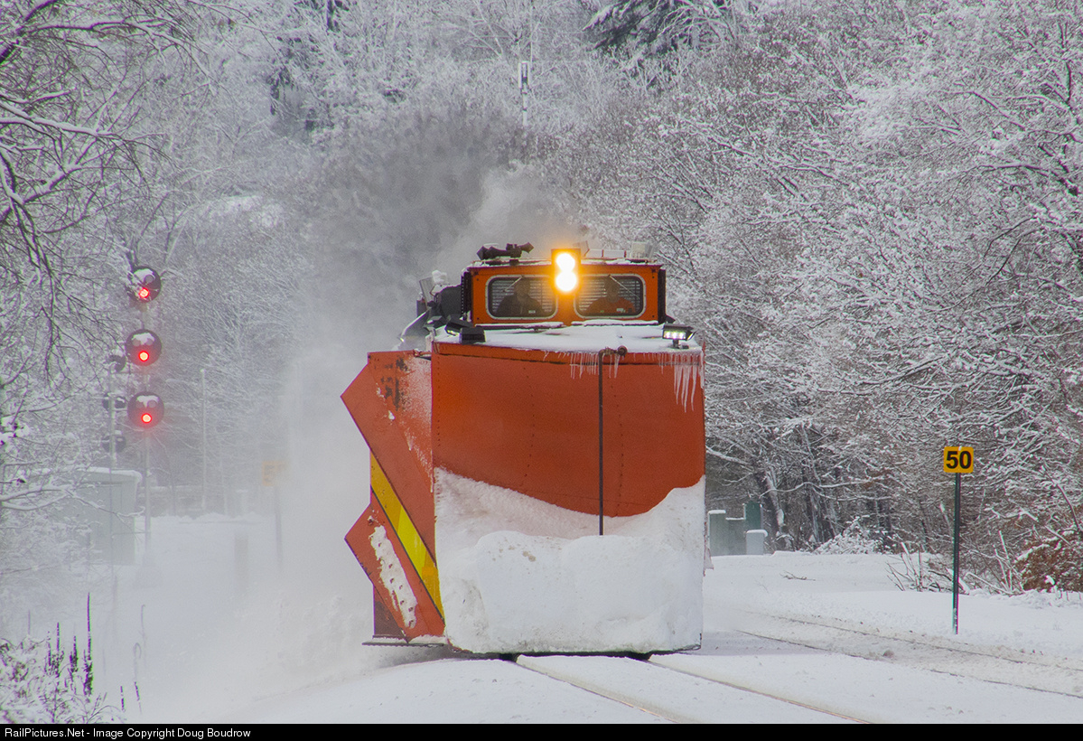 | A series of back to back snowstorms in the Boston area have been keeping work crews busy. Multiple plow extra jobs have been put on duty by Keolis which is the company that is contracted to run the commuter rail service for the MBTA. After a run West on the Fitchburg Line a plow extra returns to Boston passing though Belmont into Cambridge. A single GP40-2 is sandwiched between two wing blade plow units. |