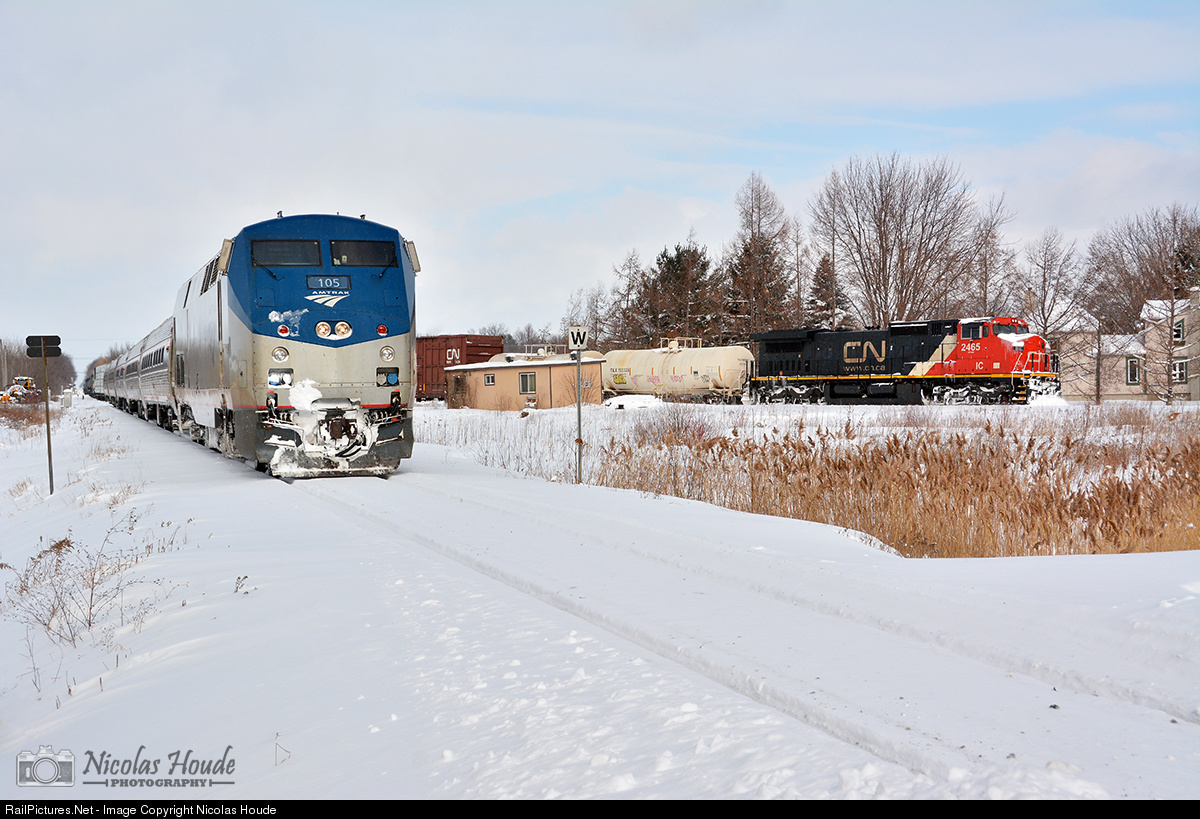 CN 324 is leaving Cantic on the Swanton Sub, on its way to St. Albans, Vermont. Closer to me, AMTK 68 is stopped on the Rouses Point Sub. Normally 68 would continue south on this line to reach Rouses Point, but because CN 529 is coming north, 68 will have to back up and go onto the Swanton sub temporarily to let CN 529 pass before going back on the Rouses Point Sub.