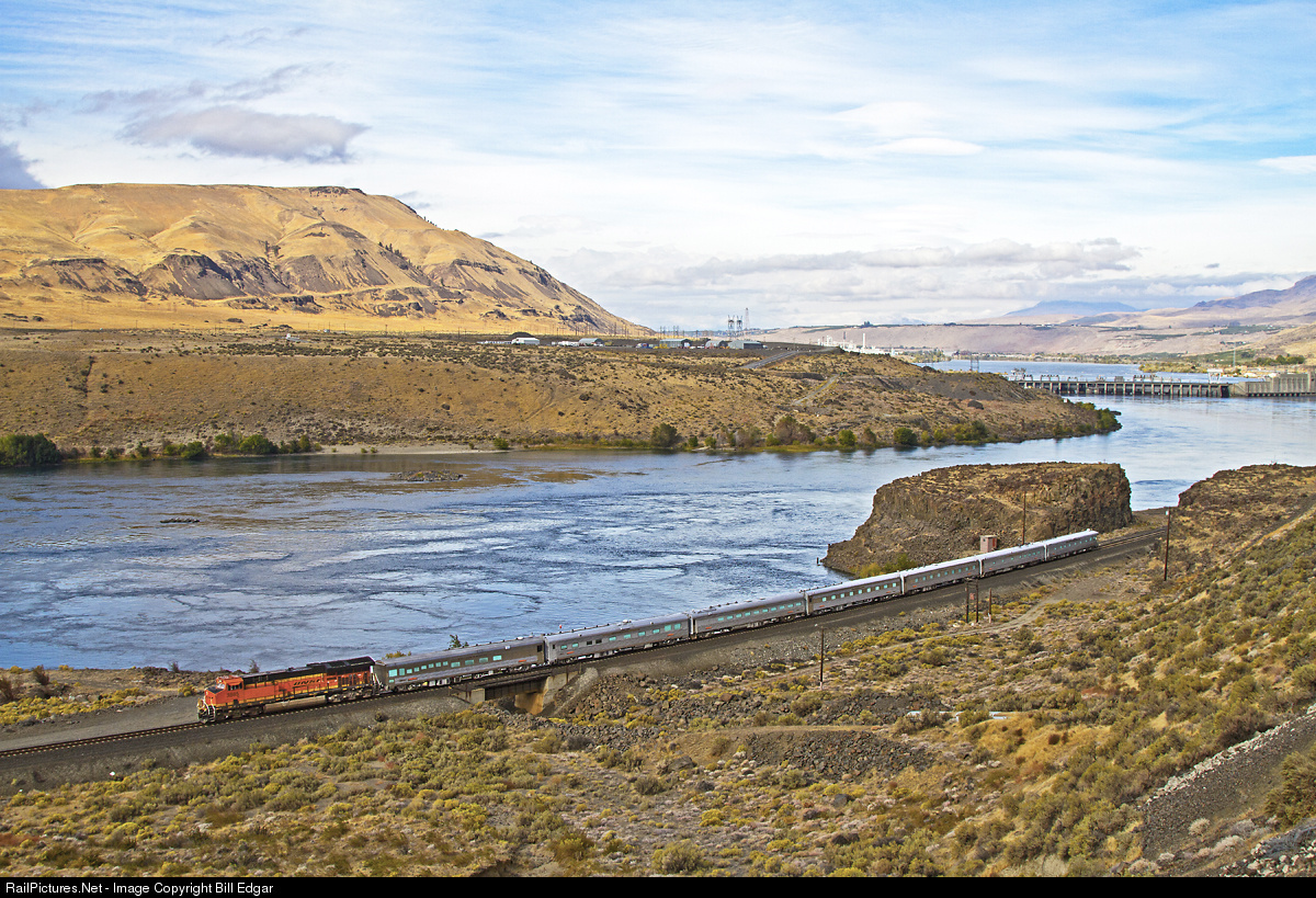 | BNSF 3885 deadheads a seven car official train east along the Columbia River below the Rock Island dam after a crew change at Wenatchee, WA. Note the pulled shades on all the cars. |