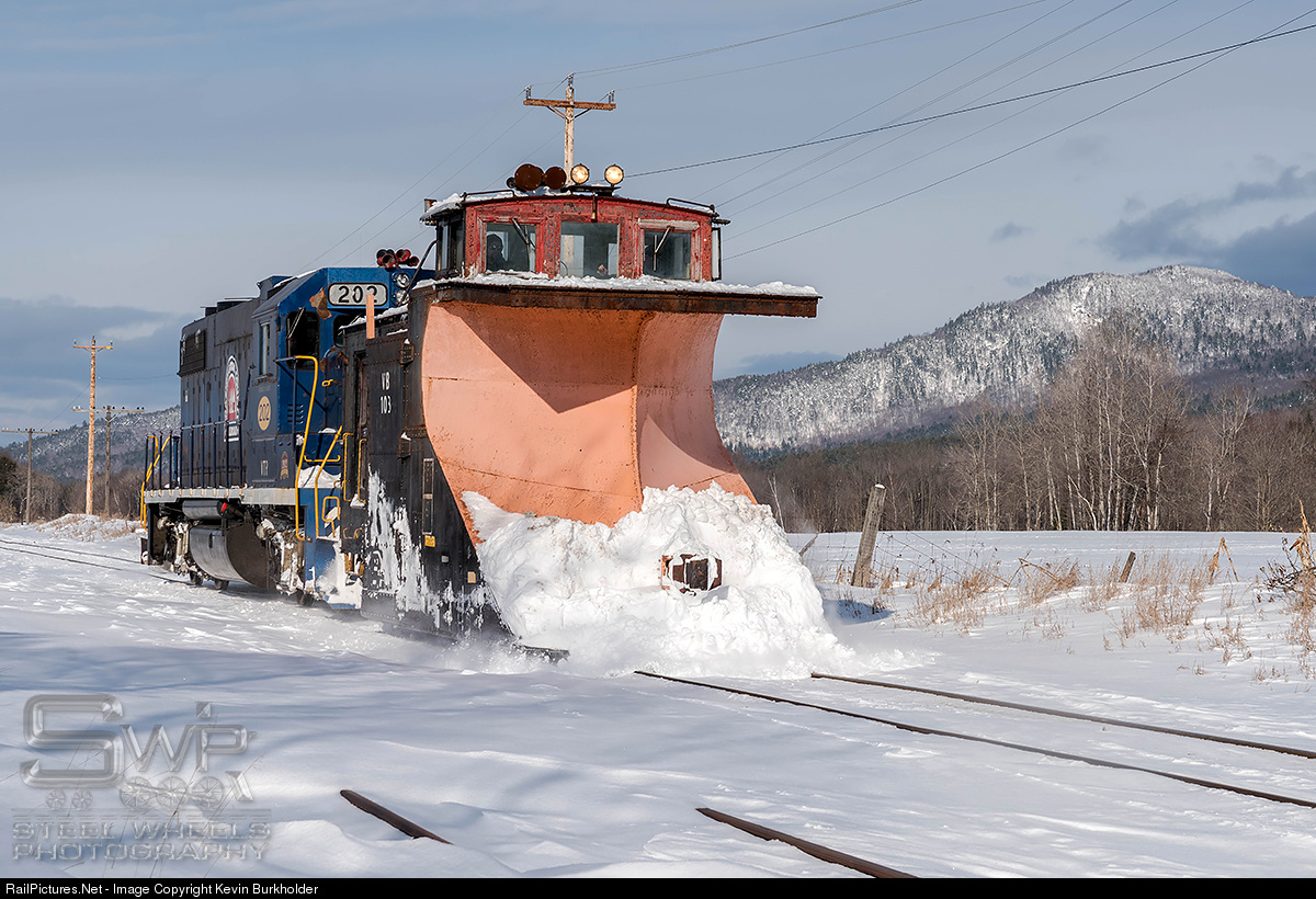 Vermont Rail System fielded two different plow trains on February 14, one running the Green Mountain Railroad's Bellows Falls Subdivision and the other clearing the Washington County Railroad's Connecticut River Mainline. The WACR Plow Extra is seen approaching East Ryegate, VT with the Vermont Railway - painted/lettered for Washington County Railroad affiliate - GP38-2 202 and borrowed Central Maine & Quebec plow VB-103.