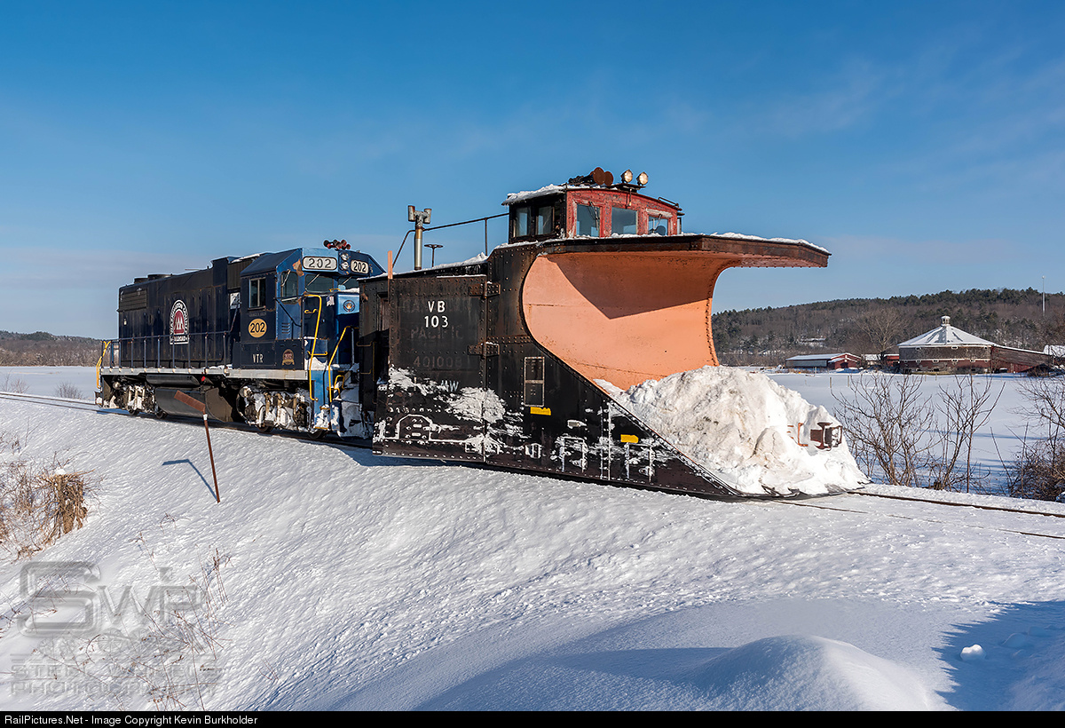 | Vermont Rail System fielded two different plow trains on February 14, one running the Green Mountain Railroad's Bellows Falls Subdivision and the other clearing the Washington County Railroad's Connecticut River Mainline. The WACR Plow Extra is seen passing one of Vermont's famous round barns near Wells River, VT with the Vermont Railway - painted/lettered for Washington County Railroad affiliate - GP38-2 202 and borrowed Central Maine & Quebec plow VB-103. |