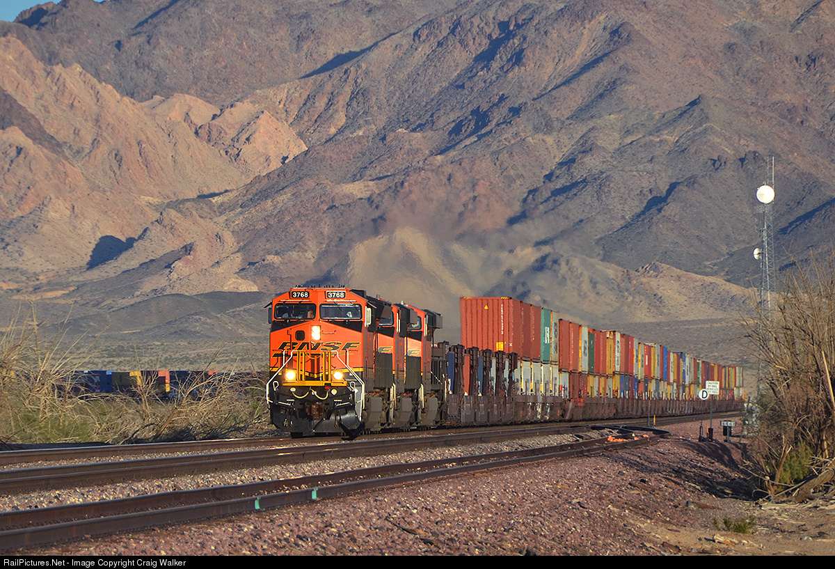 Having crossed into California about 80 miles to the east, BNSF Railway train S-LPKSCO1-11, with Intermodal Stacks heading from Logistics Park in Kansas City KS to the port of Long Beach CA, approaches Cadiz, California, on February 13, 2017. Led by BNSF ET44C4 3768, BNSF ES44C4 6882 and BNSF ES44DC 7229 (with ES44C4 6861 and Dash 9-44CW 5203 on the rear), this train was taking full advantage of the railroad's Needles Subdivision's 70 miles-per-hour speed limit.