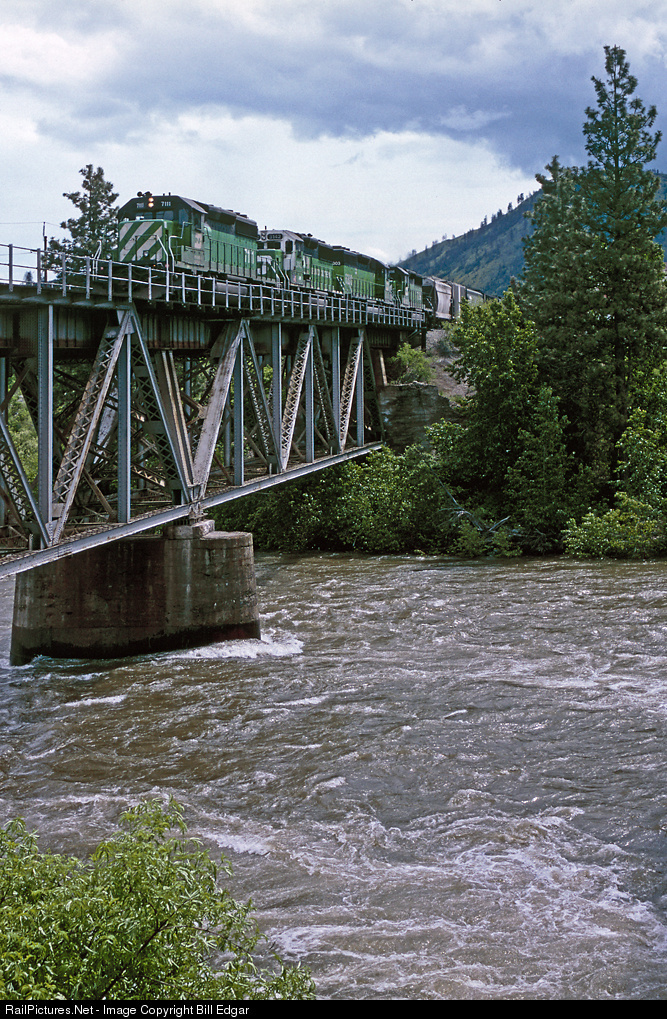 | BN 7111 leads a quartet of BN power on a manifest freight westbound at Dryden, WA. Spring run off is still in full force on the Wenatchee River, and in four months BN will be BNSF. the train is en route from Wenatchee to Seattle. |