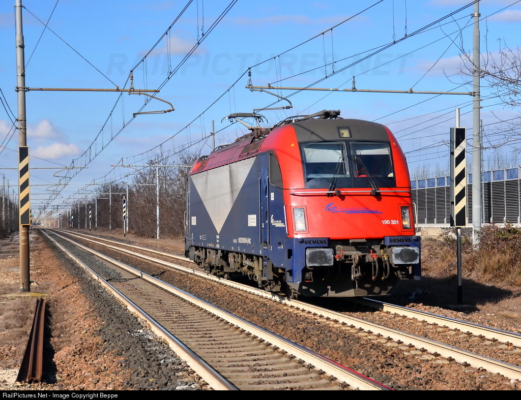 | In this shot a "Taurus" E-190-301 belongs to the company "Ferrovie Udine - Cividale" is used together with a sister in tow mainly of freight trains on several Italian state railway lines in the northeast, and occasionally for passenger trains .