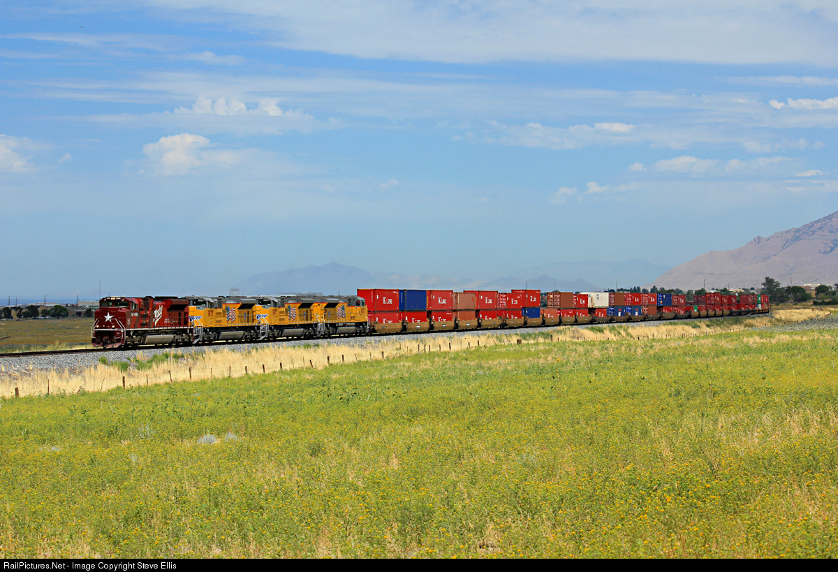 | UP 1988 leads brand new batch SD70ACe's 8673, 8671, 8672 and a nice K-line train through the Tooele Valley. |