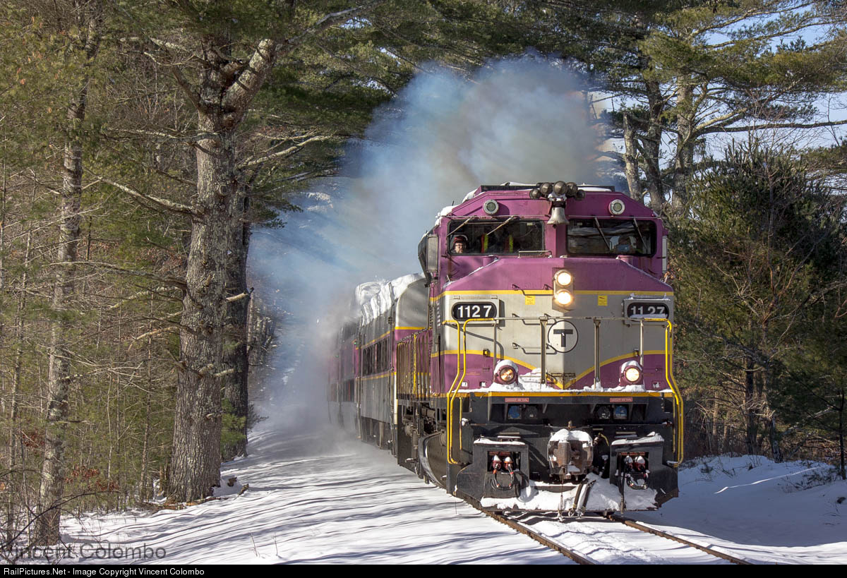 Operated by Mass Coastal with MBTA equipment and Alstom crews on board, an MBTA test train heads south on the Cape Main at Hells Blazes in Middleboro with 1127 putting on a show. The train is operating to test the recently overhauled MBTA Kawasaki coaches.