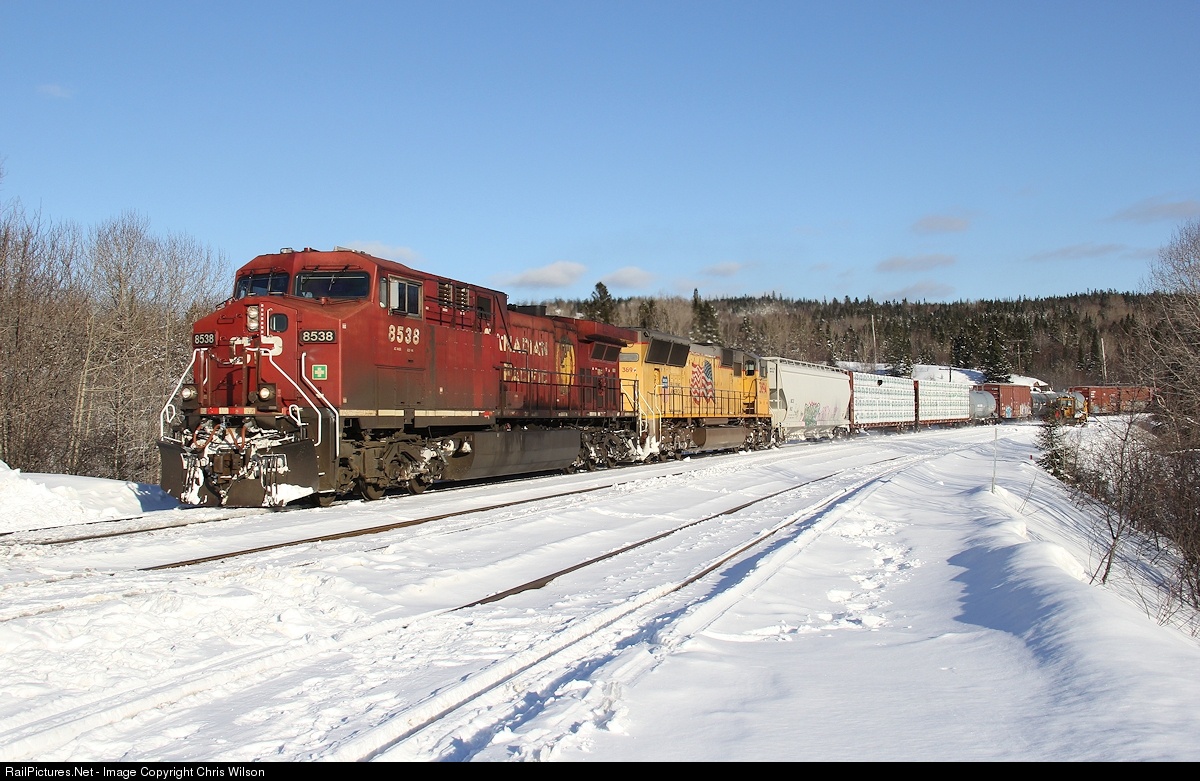 CP AC4400CW 8538 + UP SD70M 3894 have a short 57 car Toronto, ON - Winnipeg, MB well in check at Coldwell