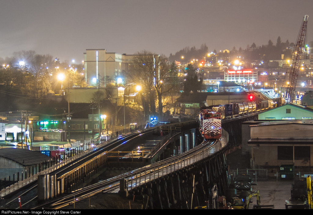 In a single long weekend, the old steel girder bridge over G street will be dismantled and then the new one moved in to place. Once both ends of the new bridge are connected to the existing track, 80 years of service will come to end for the trestle. Also under construction is a new Passenger station just under construction, the platform of which is just barely visible in the Freighthouse Square buildings, All passenger trains through Tacoma will move to this station and the new Bypass-Bypass route some time in 2017. Once the concrete bridge is complete as a single track structure, the wooden trestle will be razed and the second half of the concrete structure built. The end result will be a two track bridge, a portion of which is visible just to the left of the locomotives.